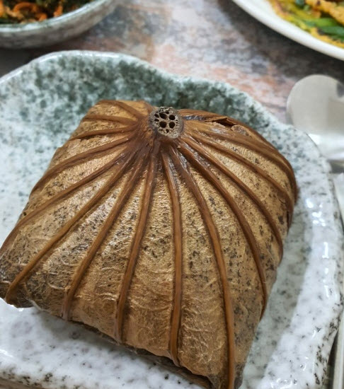 그렇게 이 집의 대표메뉴인 연잎밥정식을 시키고, 연잎향이 은은하게 풍기는 찰밥에 사장님이 대부분 직접 농사를 지어서 사용했다고 하는 밑반찬들이 입맛을 돋군다고 합니다.