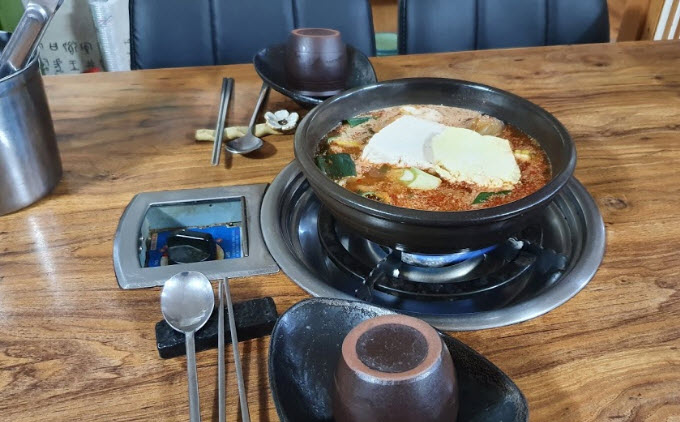 가는길이 굽이굽이 시골길을 가는듯했기에 동생이 재차 제대로 가는거냐고 묻는다. 도착하니 뭔가 우리한국정서에 어울리는 가게의 외관과 앞에 쭉 장독대들이 나열되어있었다. 바로 가게안으로 들어가자마자 풍기는 맛있는 냄새. 이곳에서 유명한 묵은지갈비전골을 주문해따아아앙~ 정갈한 비쥬얼. 두부가 손두부인듯! 너무 큼지막하다. 두부색상이 횐색도이고~ 노란색도이따!!! 노란두부??? 색다르네~일단 앉아있어도 알아서 다 갈비도 손질해주시고 묵은지도 다 잘라주신다😊 갈비도 진짜갈비다!! 심히 크고 맛이 오진다. 보글보글~ 맛있게 끓는소리.