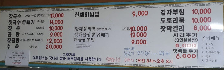 ‘아주머니 까칠하심 잣 넣은 국물이 신기하지만 먹다가 느끼해짐, 콩국수랑 다르지않는데 1만원이란 가격(이건 잣의 희소성과 고가임을 인정)과 꼭 2인이상 시켜야하는 잣국수. 한번 먹고 다시 안오기를 고대하는 가격표 가게 안이 오래된것과 별개로 너무 지저분함’