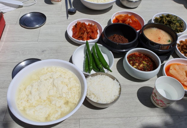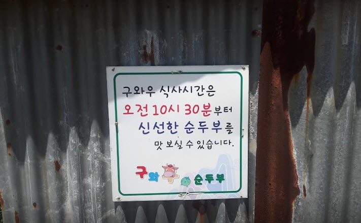 | “이 집은 태백에서 순두부 맛집으로 유명한 곳으로 9마리 소가 누운 곳이라는 구와와마을에 위치한 최고의 식당이라 한다. 특히, 야외에서 평화로운 마을을 바라보며 맛보는 순두부한그릇이 보통이 아니라는 말이 많다.” |