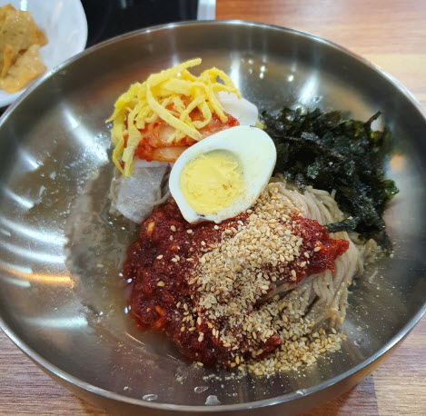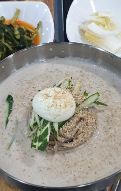 이렇게 가성비도 좋은 막국수와 담백한 국물의 만두전골이 일품이라고 말하네요.