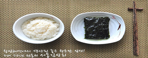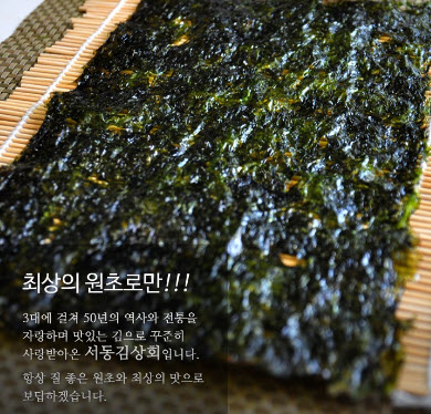 | “저희 서동김상회는 3대째 70년 전통을 이어가고 있는 건어물 도. 소매점입니다. 저희는 청정해역에서 채취된 좋은 원초만을 엄선하여 사용하고 있습니다. 60년 전통의 노하우와 직접 짠 들기름을 이용하여 즉석에서 제품을 구워드리고 있습니다. 항상 어머니의 마음으로 정성들여 구워 고객님의 식탁위에 올려드리겠습니다.” |