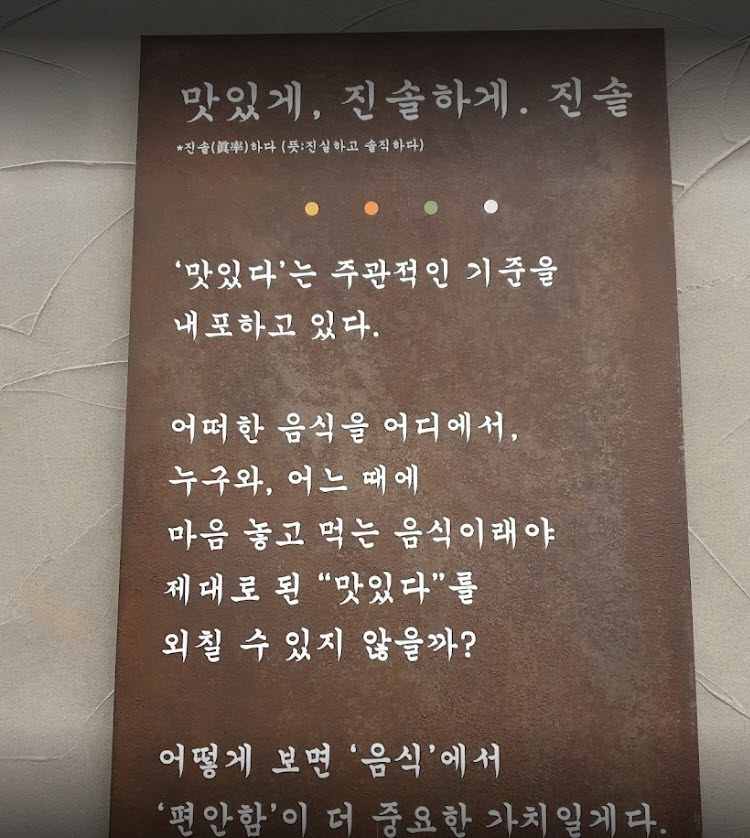 | “''맛있다''는 주관적인 기준을 내포하고 있다. 어떠한 음식을 어디에서, 누구와, 어느 때에. 마음 놓고 먹는 음식이래야 제대로 된 ''맛있다''를 외칠 수 있지 않을까. 어떻게 보면 '음식'에서 '편안함'이 더 중요한 가치일게다. 그래서 우리는 지금도 진실하고 솔직한 사람, 장소, 시간을 곁에 두는 것 아닐까? '음식'을 대하는 마음도 이랬으면 좋겠다. 발효숙성 돼지고기와 맛깔난 전라도김치가 있는 이곳은 '진솥'입니다.” |