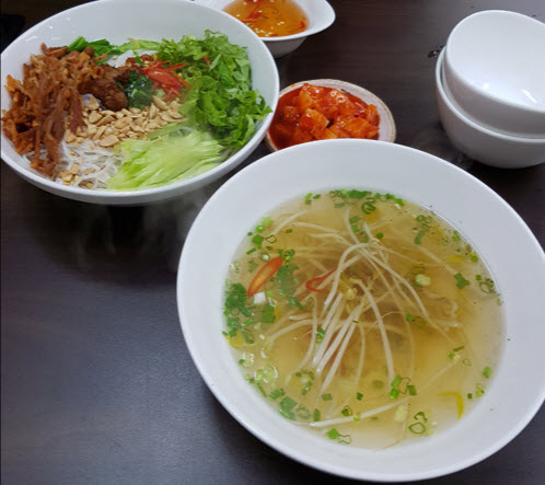 “베트남에서 먹은 쌀국수가 그리워서 찾다가 가본 집. 지역차이겠지만 그 맛은 아니어서 슬펐지만 맛있었다. 나는 쌀국수, 비빔쌀국수, 덮밥, 반쎄오, 카페 쓰어다를 먹어봤다. 쌀수국은 내가 원하는 것이 아니다. 고깃 국물과 비슷한 육수 였다. 하지만 뜨겁게 먹는 것이 좋고, 연유 커피는 여름에 마시기에 좋다. 진하고 달콤하다. 그리고 반쎄오와 비빔쌀국수, 덮밥이 맛있습니다. 비빔쌀국수에는 국수 대신 토핑을 얹은 밥이 나왔고, 소스와 땅콩의 맛은 내 입맛에 딱 맞았다! 그리고 비빔쌀국수를 시키면 국물이 너무 나와 두 가지를 느낄 수 있답니다! 그러나 이곳을 처음 발견하면 복잡한데, 이유로는 수유시장 롯데마트 1층 식당이 가장 안쪽이기 때문이지만 나는 집 근처에 있어서 반쎄오와 비빔쌀국수가 생각날 때마다 갈 것이다.”