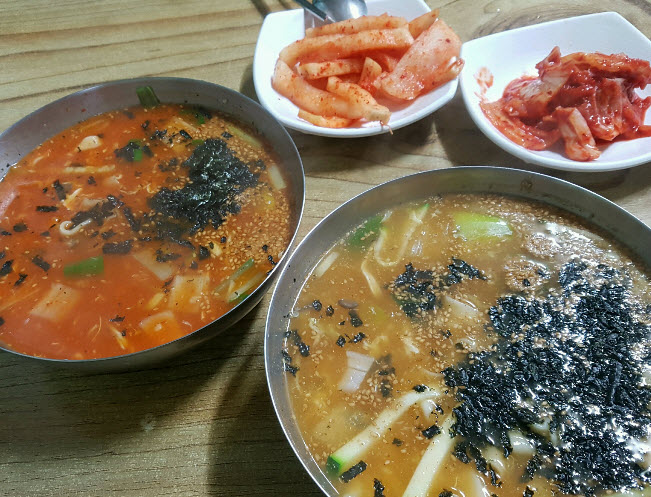 “칼국수를 줄서서 먹어보긴 처음. 40-50분정도 기다렸음. 매운맛이 단계별로 5단계가 있다.(아주매운맛, 기본매운맛, 덜매운맛, 장끼맛, 하얀칼국수) 우리는 기본매운맛이랑 라면맵기정도의 장끼맛을 주문함. 장끼는 왜 장끼인지는 모르겠지만 기본매운맛은 불닭볶음면정도의 맵기임. 맛있어서 좀 놀랬다. 장끼맛은 익숙한 칼국수맛이었고 기본매운맛 칼국수는 첨 접해보는 장칼국수였는데 엄청 칼칼하고 계속 생각날것같은 맛임. 둘다 다른 맛인데 두가지를 꼭 같이 시켜서 먹어보시길! 공기밥을 시켜서 꼭 말아먹으란 얘길들었는데 진짜 제발 꼭 공기밥을 시키길 추천한다. 면을 남기더라도 꼭 밥을 말아드세요. 강릉에 줄서서 먹는 칼국수집이 몇군데 있는것 같은데 다른곳도 가보고 싶게 만드는 곳이었다. 전날 과음해서 더 맛있게 느꼈는지도 모르겠음.”