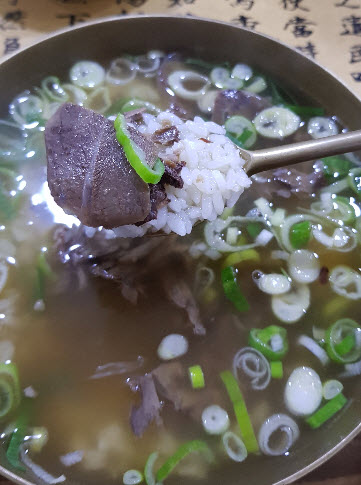 그런 맥락으로 이 리뷰어 역시 “진짜 엄청 맛있네요. 국밥이 이렇게 맛있어도 되는지 생각이 들 정도네요. 하동관보다 좀 더 간이 되어 나오는데 전 하동관에서도 소금을 좀 넣어먹어서 느낌은 비슷비슷한거같아요. 어쩌면 여기가 더 맛있을지도.. 암튼 둘 다 진짜 국밥계 최고봉 중 하나라고 말 할 수 있을거같아요. 추천합니다.”라며 어마어마 하게 맛이 좋다고 말하며 “평양냉면과 슴슴한 곰탕을 즐기며 ‘이제 난 어른 입맛이야’ 라고 생각했던 나를 어른이 입맛으로 돌려버리는 곳. 맑은 고기 육수를 간장으로 조미한 후 얇게 저민 살코기 고명을 올려 내주니, 남녀노소 싫어할래야 싫어할수가. 간간한 국물이 밥과 더 잘 어우러지긴 하지만, 부드럽게 넘어가는 미끈한 쌀면과도 상당히 잘 어울린다. 새콤하게 잘 익은 김치도 국밥, 국수와 아주 찰떡궁합. 토렴되어 나와 입천장 아끼며 바로 흡입할 수 있는 것도, 한사발 보기에도 든든한 양으로 나오는 것도 좋았다. 조미료 맛이 강하다는 생각을 하면서도, 수저질은 멈춰지질 않는다.”라며 일단 먹는 것에 집중하게 되는 맛이라고 합니다.