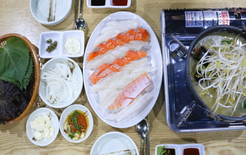 미역국. 쌈. 김치 있었어요. 라면. 감자수제비까지... 먹다보니 너무 많아서 셀프로 가져온 쌈이 남아서..저렴하게 골고루 맛보기 좋아요. 그 와중에도 직원들도 친절하고. 방송 나온지 얼마 안되서 더 많은건가.”라며 이곳이 정말 맛집이라고 말을 합니다.