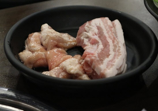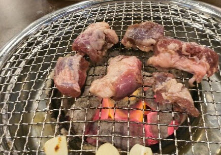 이렇게 고기가 다 익으면 익은 고기를 가장자리로 옮기면서 새로운 고기를 올리면서 고기가 끊이지 않게 만들어 줍니다.
